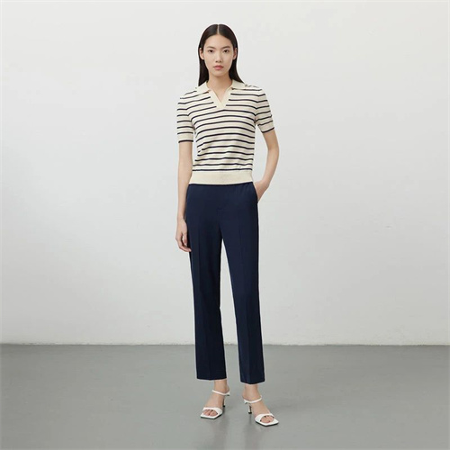 在通勤路上,直筒九分褲和條紋T恤是經(jīng)典的穿搭選擇。V領(lǐng)設(shè)計(jì)和白色鞋的加入則讓整個(gè)造型更加精致時(shí)尚,讓你在繁忙的工作中也能保持著優(yōu)雅與時(shí)尚的氣質(zhì)。