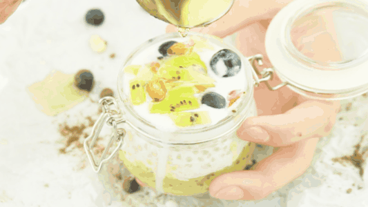 3、找個玻璃杯,依次加入獼猴桃果醬,椰奶西米露,再加上藍莓、杏仁碎、奇異果片裝點下,最后滴上幾滴蜂蜜即可。