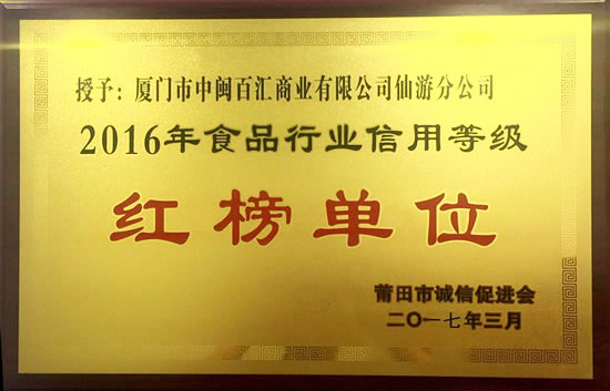 2016年度食品行業(yè)誠(chéng)信紅榜單位