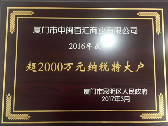 廈門市中閩百匯商業(yè)有限公司2016年度納稅特大戶