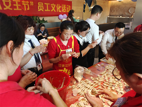 3月9日,門店在一樓德克士旁租賃商鋪舉行“三八女王節(jié)”員工包水餃活動(dòng),員工們?cè)跉g樂(lè)的節(jié)日氛圍中開(kāi)展包水餃活動(dòng),一起慶?!叭藡D女節(jié)”的到來(lái)。此次活動(dòng)豐富了員工的業(yè)余生活,提高了員工的企業(yè)歸屬感,營(yíng)造了節(jié)日的氣氛。