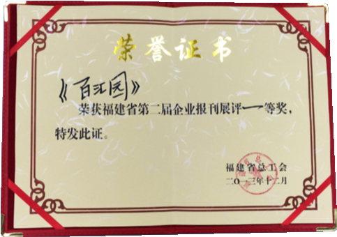 百匯園榮獲省第二屆企業(yè)報(bào)刊展評(píng)一等獎(jiǎng)獎(jiǎng)狀