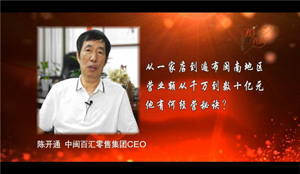 為慶祝新中國成立70周年,《泉州財經(jīng)報道》推出“70年70人 · 共圓中國夢”人物自述系列專題,欄目選取70名產(chǎn)經(jīng)界及各行各業(yè)的代表人物,從企業(yè)家到一線工人,從科技研發(fā)帶頭人到產(chǎn)品銷售員,年齡層次跨越40后到00后,通過他們的自我敘述,講出個人的經(jīng)歷和故事,見證泉州的經(jīng)濟發(fā)展和共和國的偉大跨越。他們也是新時代的追夢人。70年70人,共圓中國夢的人物,中閩百匯(中國)零售集團有限公司CEO陳開通。