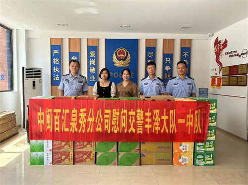 2023年7月6日,泉秀店代表蔡建容店總與東美社區(qū)張玲書記一同帶著礦泉水和飲品看望慰問一線執(zhí)勤交警,為他們送去夏日的清涼和關(guān)懷。